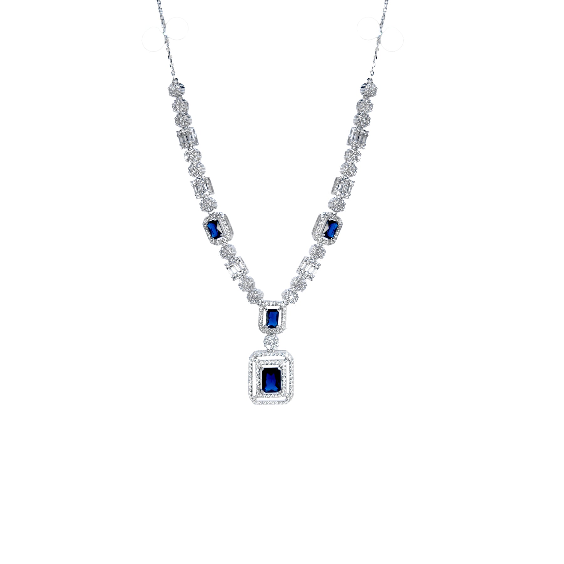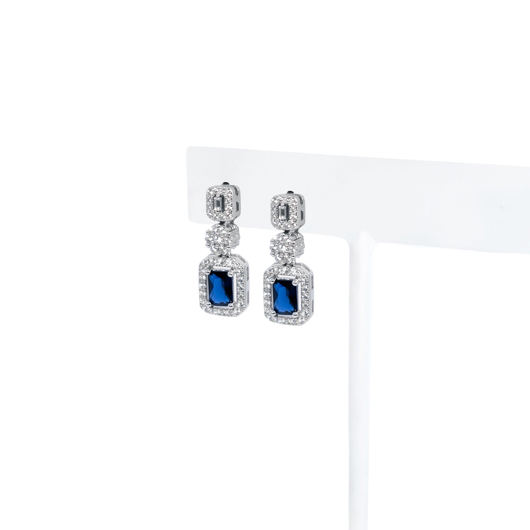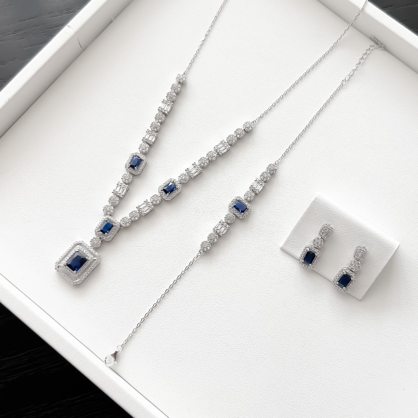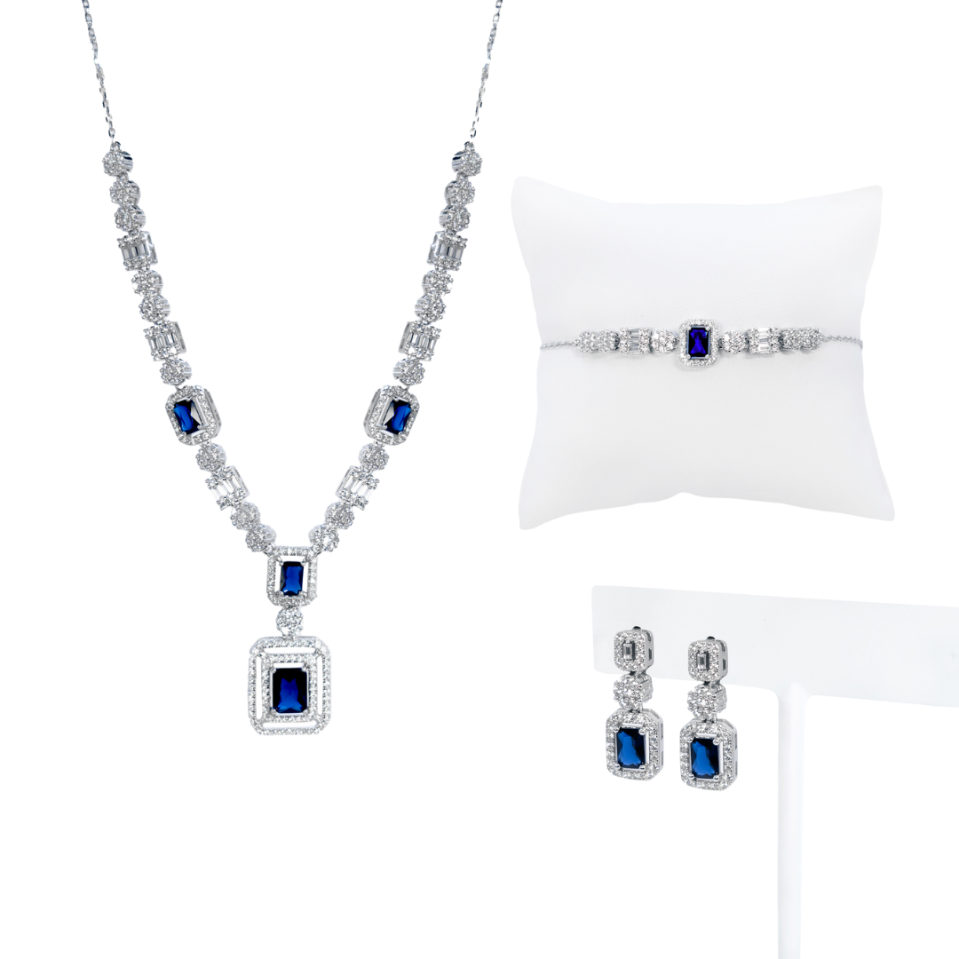 Set completo rectángulo azul (incluye collar y pulsera con broche de extension y aretes con broche de mariposa)