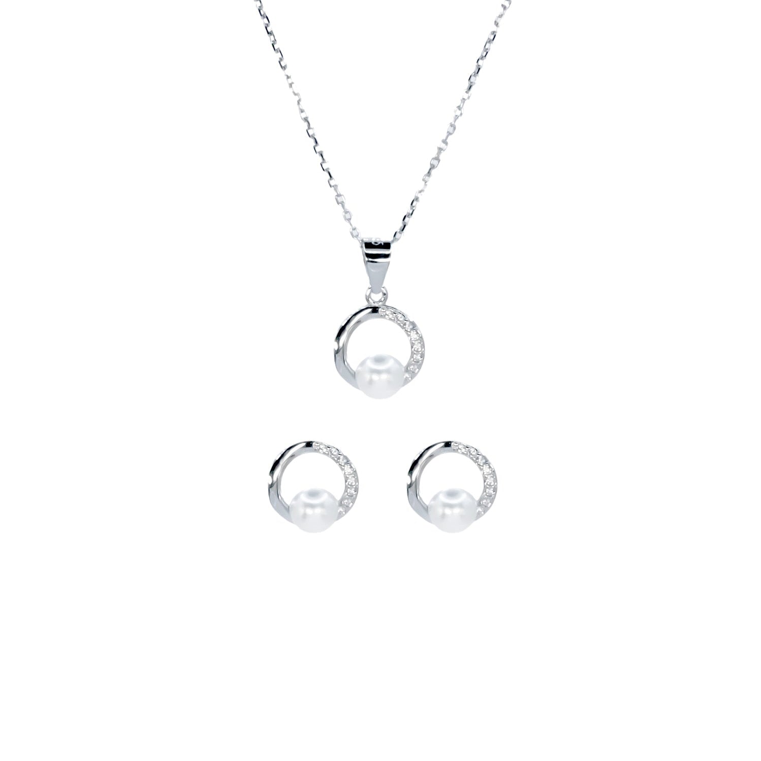 Set círculo con perla natural(incluye collar con cadena de extension y broqueles con broche de mariposa)